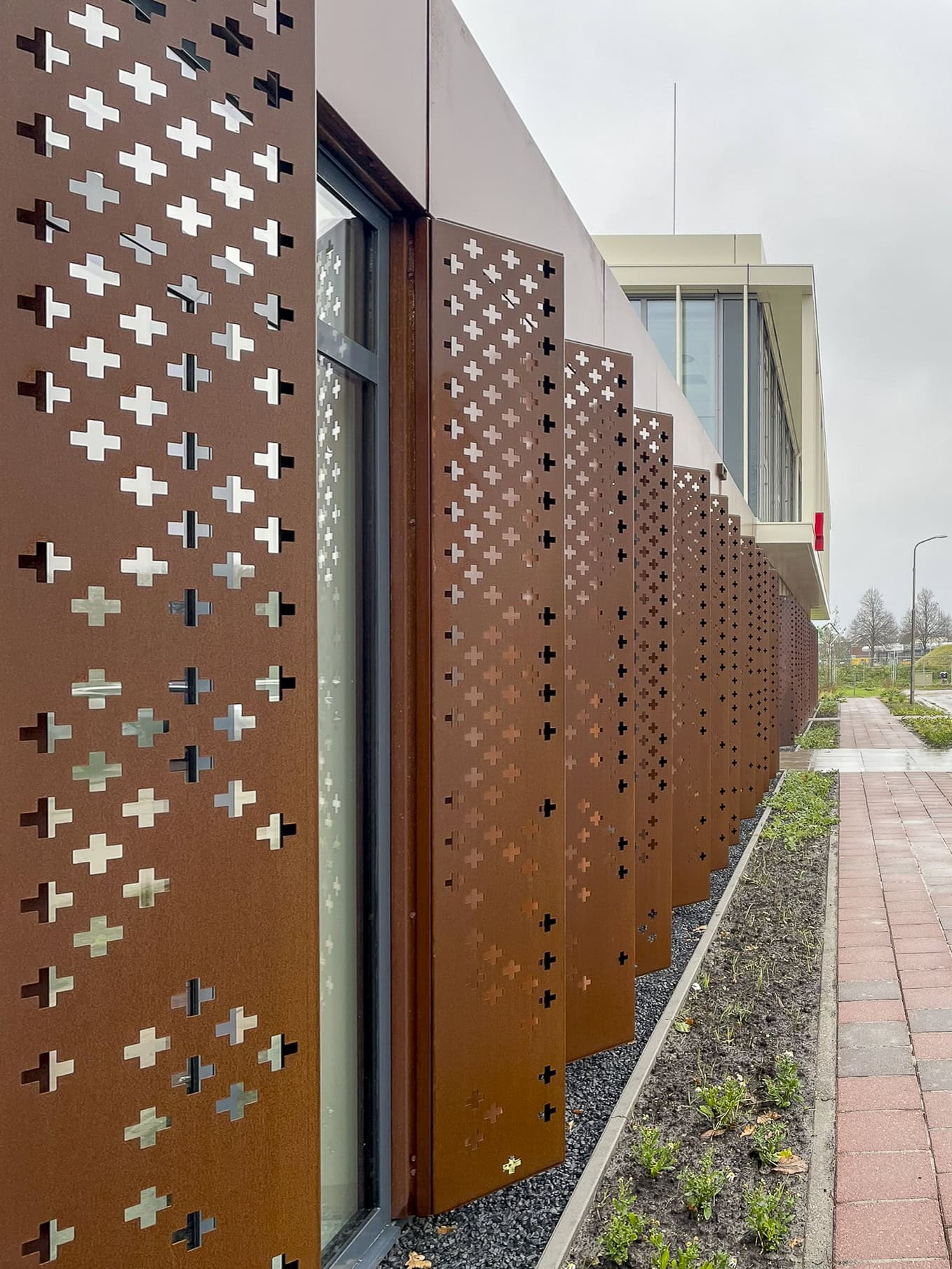 Het centrale deel van het gebouw is vormgegeven naar het Kruis van Genève, een internationaal erkend symbool van bescherming in conflictsituaties. Dit symbool is niet alleen terug te vinden in de plattegrond van het gebouw, maar ook subtiel verwerkt in de gevel, waar cortenstalen lamellen geperforeerd zijn met het kruispatroon.