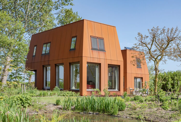 Rondom de houten kozijnen zijn zetwerken gemaakt uit Corten staal. Door deze op te delen in 2 profielen is er een gootprofiel gecreëerd. Om water te kunnen opvangen en afvoeren dat via de panelen naar beneden komt. En omdat Corten staal de eerste jaren afgeeft hebben wij gekeken naar de afvoeren van het regenwater. Als dit water op enige manier op het glas komt ontstaan er sporen die niet meer weg te krijgen zijn.